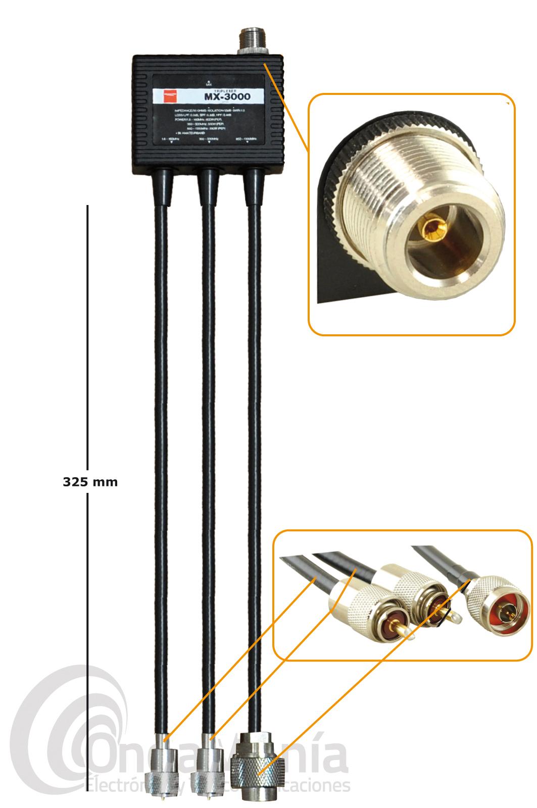 Triplexor con conector de entrada“N” y tres salidas con cables y conectores “N y PL” entre 1,6 a 160 Mhz. salida con conector PL, 350 a 500 Mhz. salida con conector PL y 850 a 1.300 Mhz. salida con conector N con una potencia máxima de 800W de 1,6 a 160 Mhz, 500W de 350 a 500 Mhz, 200W de 850 a 1300. Con cables en la salida.