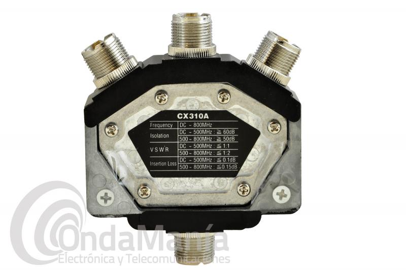 Conmutador coaxial de 3 posiciones con conectores tipo PL , es original Diamond y tiene una anchura de banda de hasta 800 Mhz y una potencia máxima de 1 KW de 30 a 150 Mhz y de 500 W de 150 a 800 Mhz.