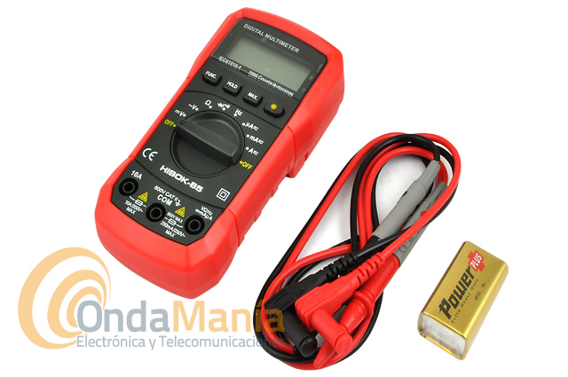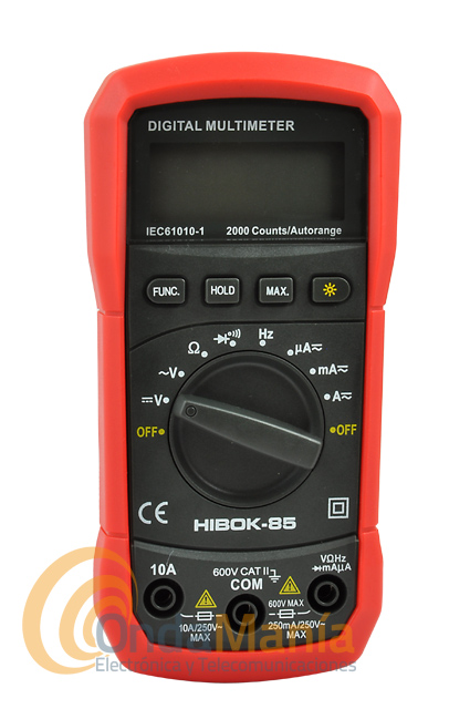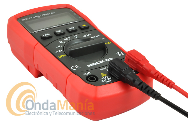 Polímetro/Múltimetro con 28 posiciones de medida y con un gran display LCD retroiluminado de 14 mm, dispone de selección manual de rangos e incluye protector de goma anti golpes