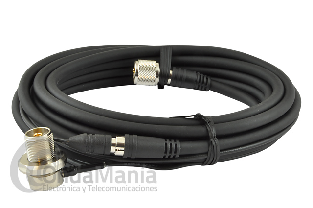 Base de antena con conector PL hembra y 5 mts de cable de baja perdida, en su extremo lleva un conector PL macho desmontable.