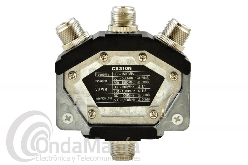 Conmutador coaxial de 3 posiciones con conectores tipo N, es original Diamond y tiene una anchura de banda de hasta 1500 Mhz y una potencia de 1 KW de 30 a 150 MHz, 500 W de 150 a 500 MHz , 250W de 500 a 1000MHz y 150W de 1000 a 1500 MHz.