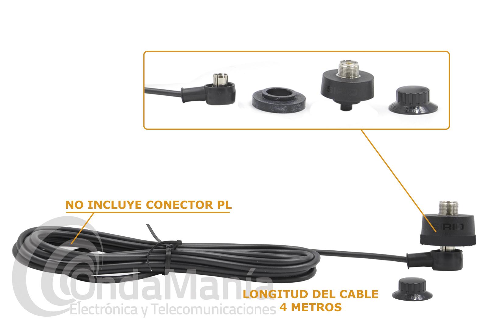 Base PL de perfil bajo. Compatible todo tipo de antenas PL (SO239) Conector tipo NE en la parte inferior con 4m de RG58. Fijación mediante tornillo., no incluye conector PL en su extremo. Es ideal para ser utilizada en vehículos y aplicaciones de banda ciudadana, VHF y UHF, también es ideal para utilizarse en soportes tipo KF-100, KF-110, RB-400, RB-600, K-400, RB-60,....