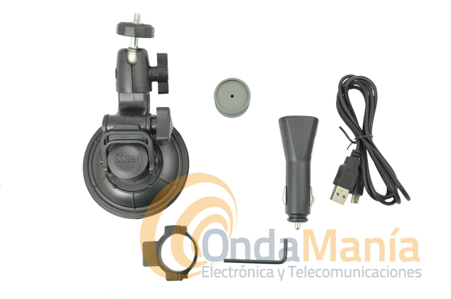 Kit de fijación especial en vehículo con ventosa para fijación para cristal con dos puntos de articulación, incluye cable de alimentación con toma USB para carga y alimentación con toma de mechero a 12V.