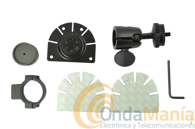 Soporte aluminio con fijación adhesiva pensado para aplicaciones de espacio reducidos (6.5 cm), motocicletas, aviones, o cualquier superficie plana que se pueda imaginar.