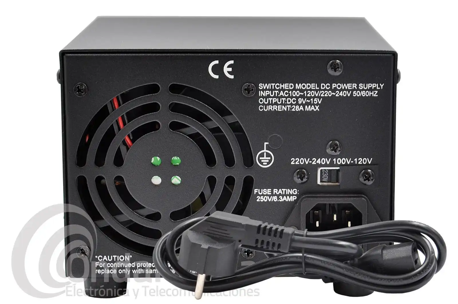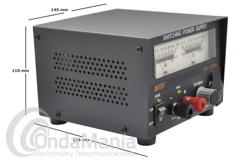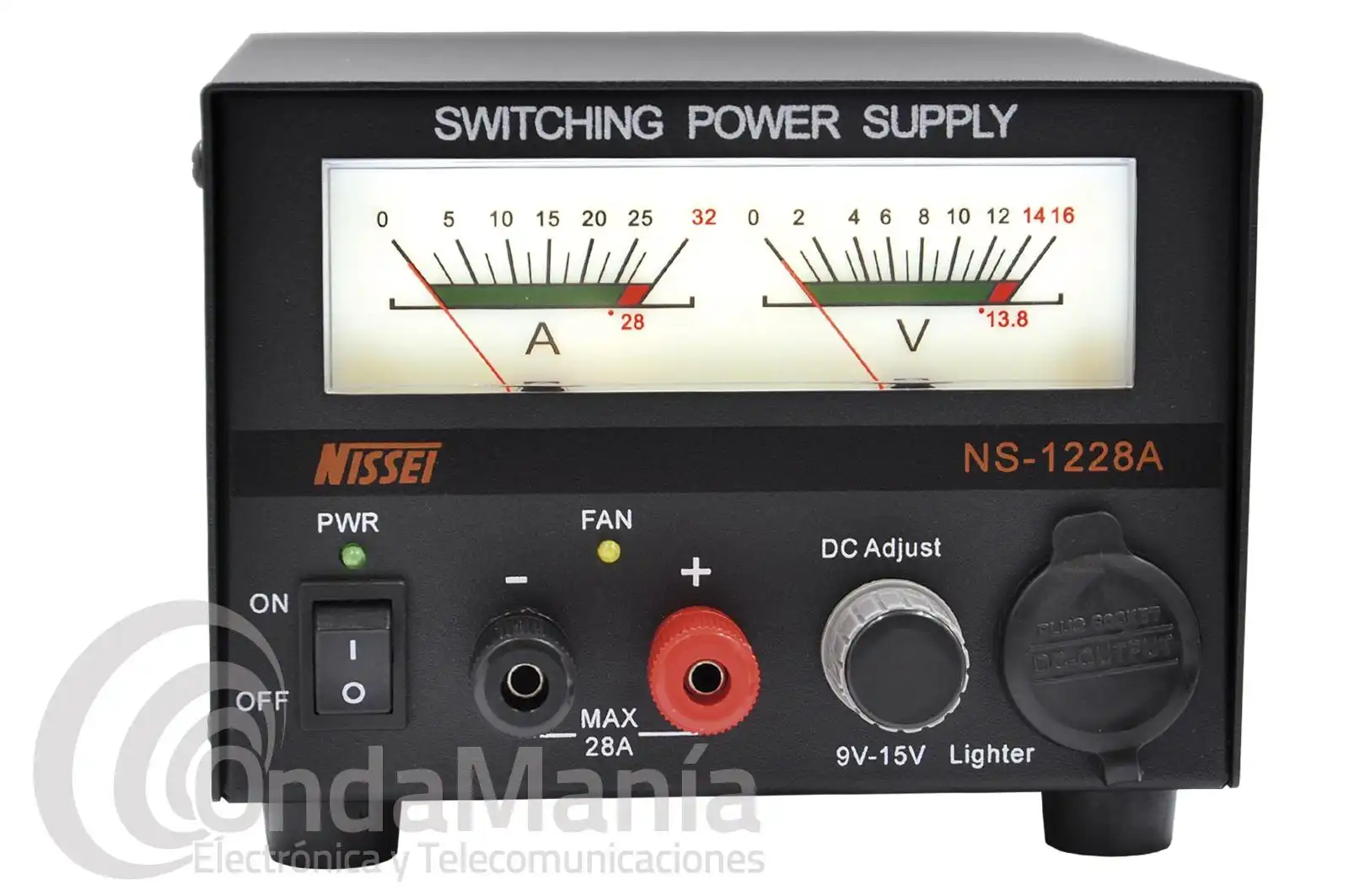 Fuente de alimentacion Nissei NS-1228A regulable de 9 a15 VCC, con una intensidad de 25 Amp. continuos y 28 Amp. de pico, dispone de 2 instrumentos, voltímetro y amperímetro retroiluminados , dispone de protección contra sobretensión y cortocircuito.