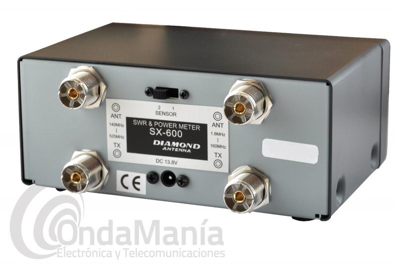 Medidor Diamond SX-600 con dos sensores, sensor S1 de 1,8 Mhz hasta 160 Mhz y el S2 de 140 a 525 Mhz, con una potencia máxima de 200 W, posee botón para lectura de picos (AVG) y mide potencia directa y reflejada. Dispone de 3 escalas de potencia: 5W, 20W Y 200W.