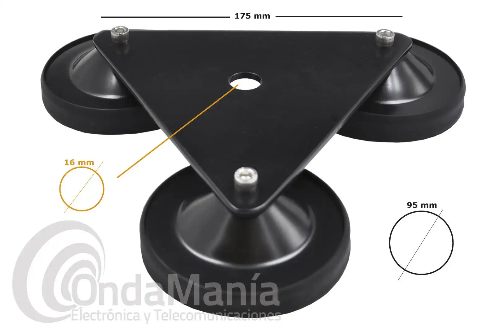 Base magnética con tres imanes, diseñada y construida para la instalación de antenas incluso de gran tamaño utilizando su propia base y cable.