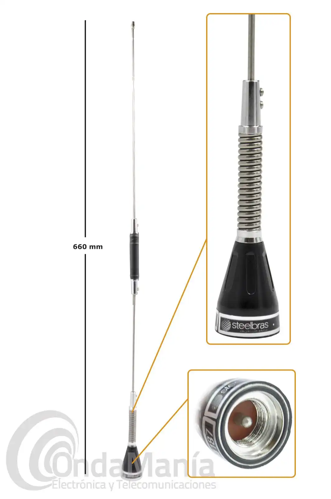Antena móvil, varilla y bobina con muelle y conector PL para banda ciudadana CB-27 construida en acero inoxidable de alta calidad y latón cromado Steelbras Evolution AP-24187