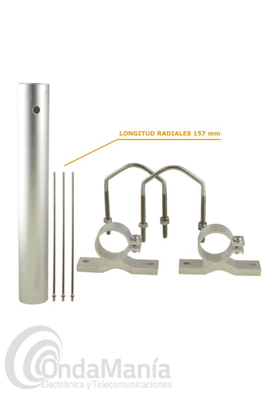 Antena de base de fibra de color blanco, tribanda 144/430/1200 mhz con una longitud de 1,8 mts, 3 radiales y una ganancia de 4,5 dBi en 144 Mhz, 8,3 dBi en 430 Mhz y 11,7 dBi en 1200Mhz, con 3 radiales y conector N hembra en su base.