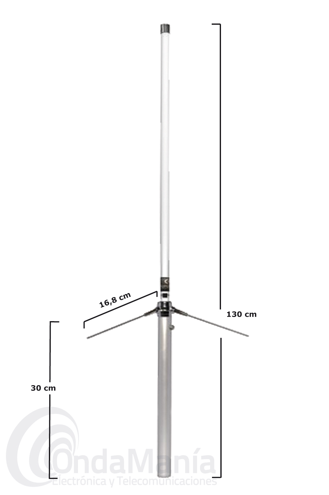 Antena de fibra de vidrio doble banda VHF/UHF 144/430 MHz, con una longitud de 1,30 mts y 150 W de potencia.
