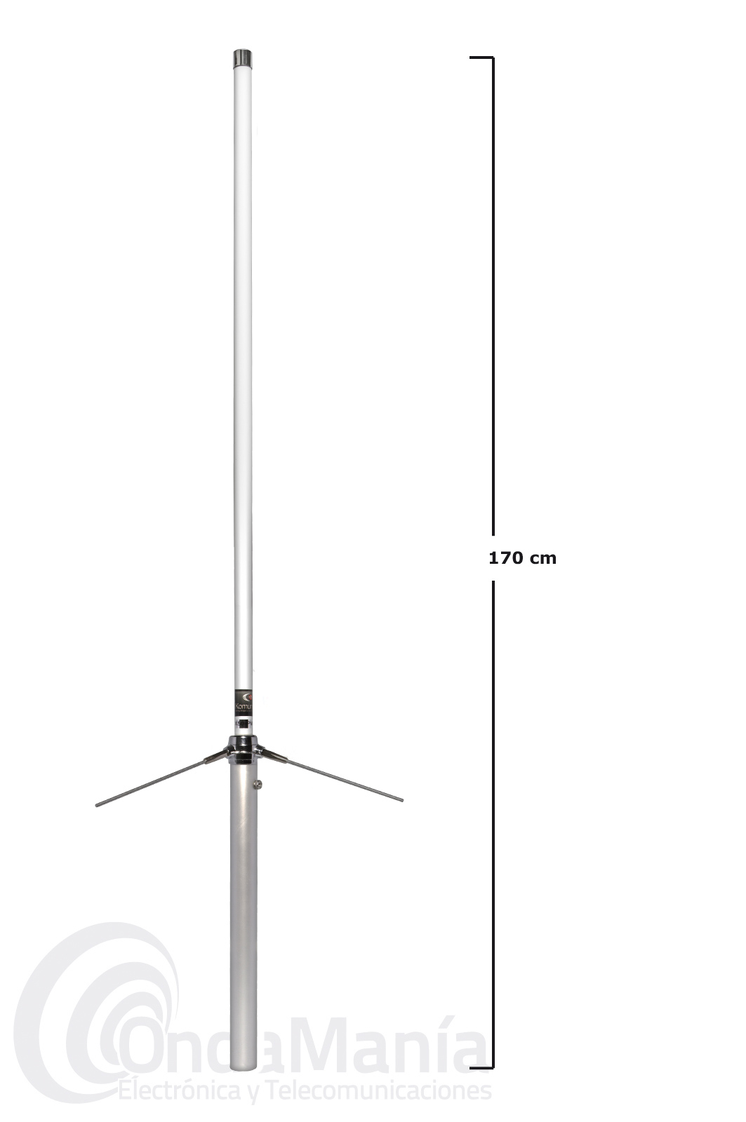Antena de fibra de vidrio doble banda VHF/UHF 144/430 MHz, con una longitud de 1,70 mts y 350 W de potencia.