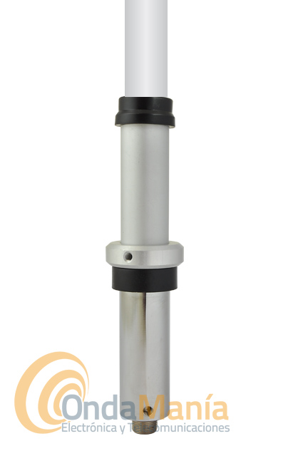 Antena de base de fibra de vidrio doble banda UHF y VHF con una longitud de 520 cm en tres tramos y 300 W de potencia máxima.