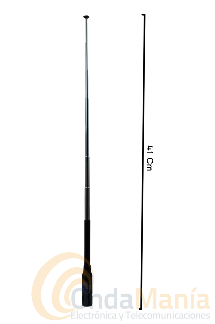 Antena Diamond original (Japón) RH-775 telescópica de doble banda (144/430 Mhz) con conector “BNC”, con una longitud de 41 cm. y una ganancia de 2.15 dB en UHF. Admite una potencia máxima de 10W.