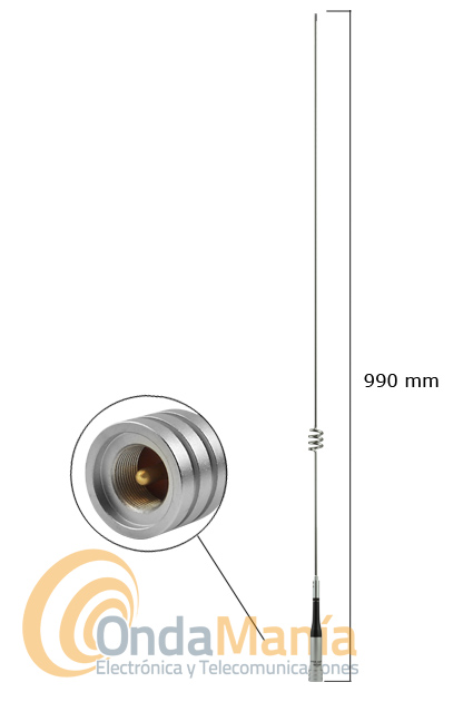 Antena Diamond doble banda VHF y UHF para móvil con una ganancia de 2,15 dB en VHF y 5,5 DB en UHF, tiene una longitud de 0,99 mts y un peso de 305 gramos