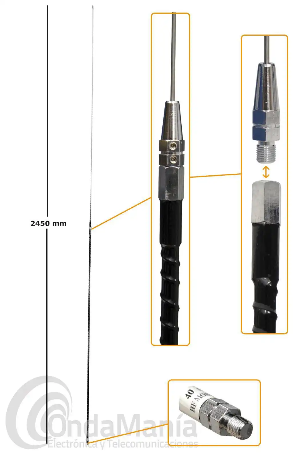 Antena para móvil con conector de 3/8 para la banda de 7 Mhz o 40 metros, tiene una longitud de 245 cm aprox. y soporta una potencia máxima de 250 W.