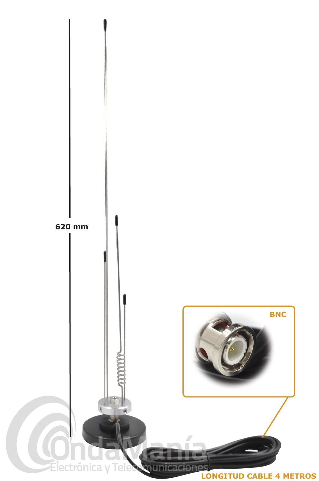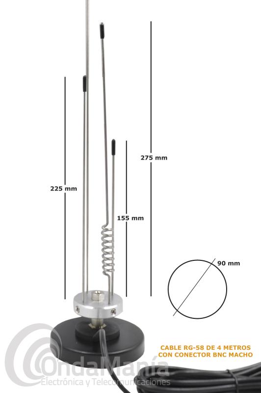 Antena magnética para recepción con 4 metros de cable RG-58 y un conector BNC macho en su extremo, la base magnética tiene un diámetro de 90 mm y tiene un rango de frecuencia de 25 a 2000 Mhz.