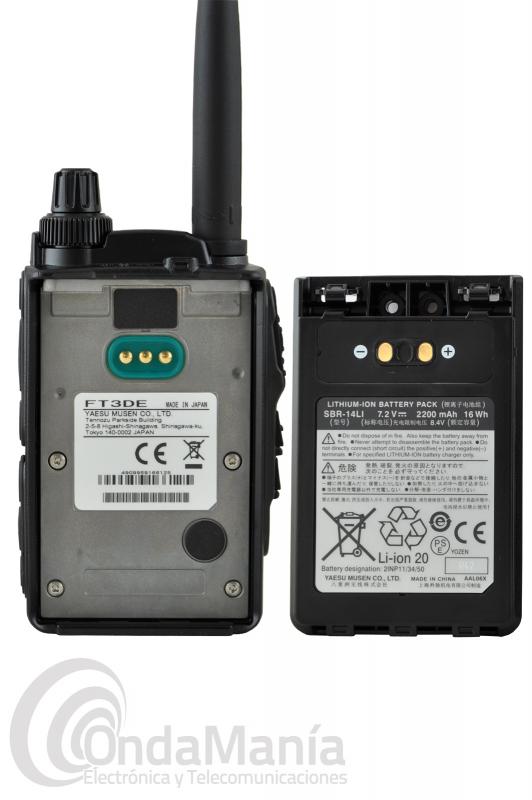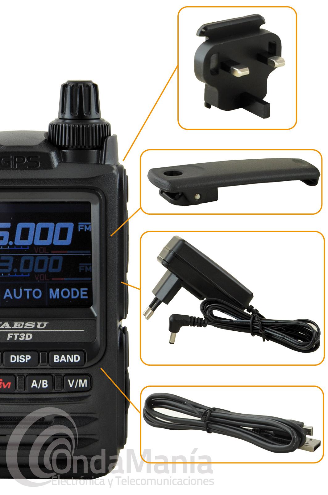 Accesorios suministrados: Yaesu FT-3D, batería de litio SBR-14Li con 7,2V y 2200 mAh, Cargador de batería SAD-25C, antena, clip de cinturón, cable USB, manual de instrucciones, tapa protectora para conjunto de la batería.