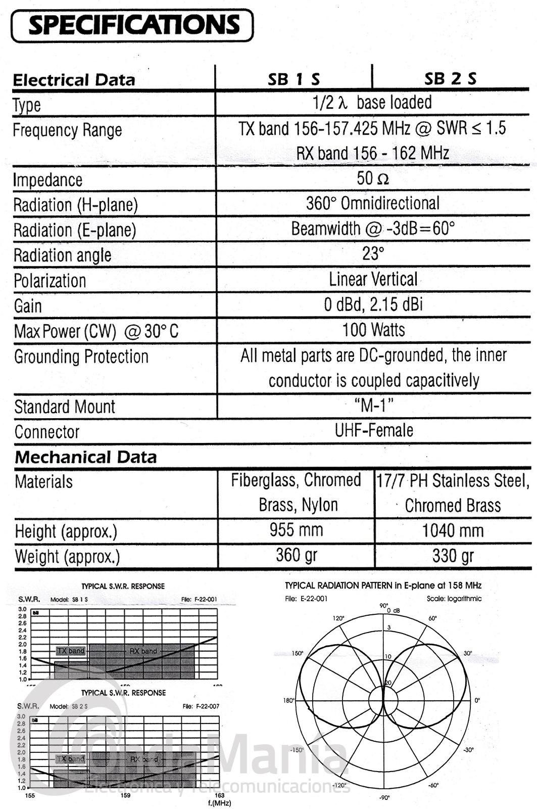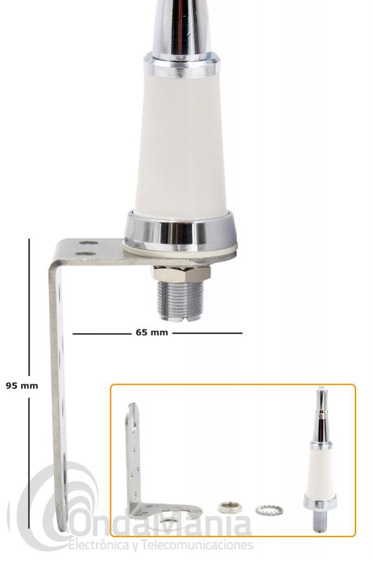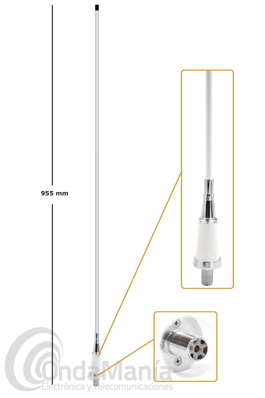 Antena náutica Sirio SB1S de VHF con elemento radiante encapsulado en fibra de vidrio de alta calidad y de color blanco, tiene una longitud de casi 1metro, se suministra con soporte M1 de acero inoxidable para sujeción en mástil, con conector SO239 PL hembra en la base.