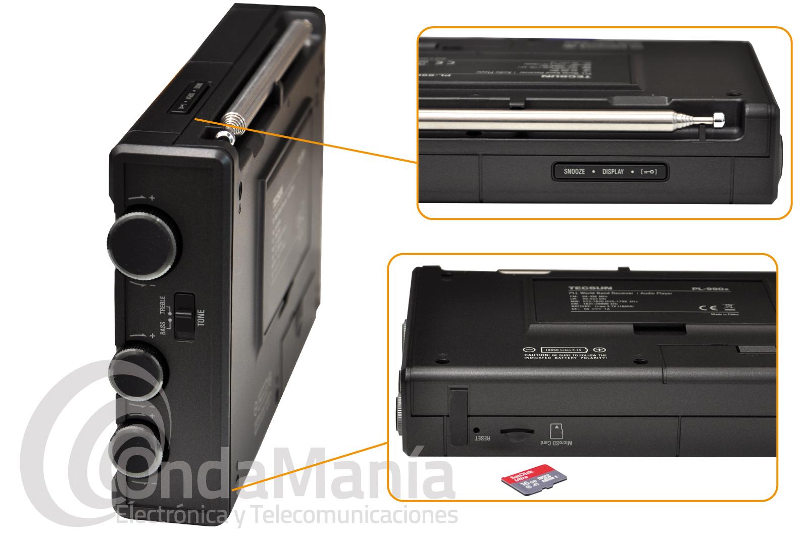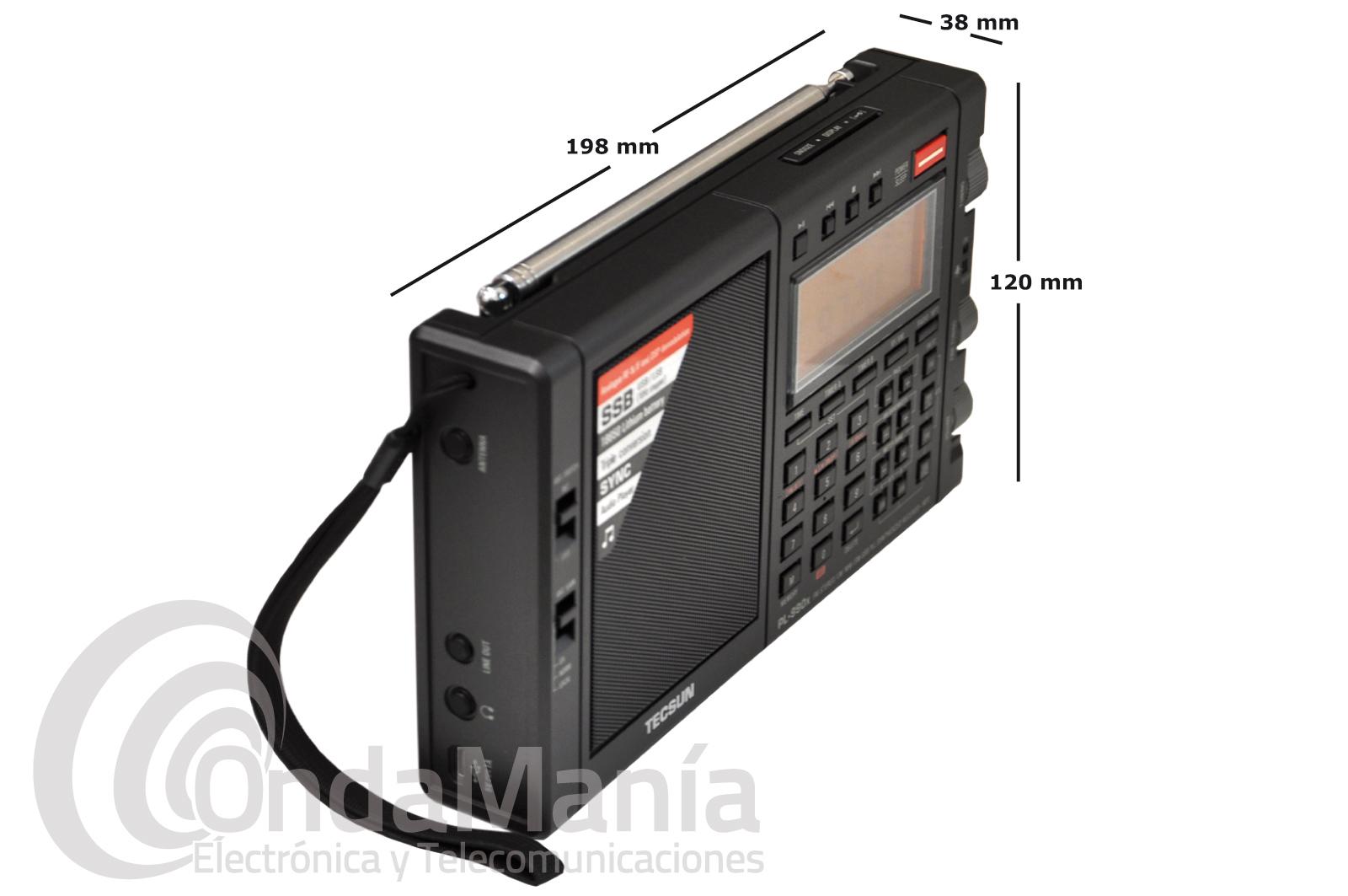 Receptor escáner con avanzadas funciones como recepción en AM con triple conversión, banda lateral SSB con LSB y USB, DSP (Procesador Digital de Señal), toma de antena exterior a través de un jack de 3,5 mm, alarma, sleep timer, ajuste de graves y agudos, line out, audio player, compatible con tarjetas mico-SD, incluye batería de litio y toma de carga a través de USB-mini,.....