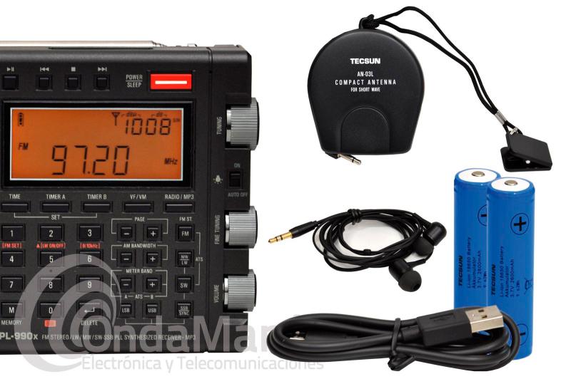 Incluye: receptor Tecsun PL-990X, 2 baterías de Ion-Litio con 3,7 V y 2600 mAh, antena compacta Tecsun AN-03L, auriculares, funda, cable de carga pon mini-USB, manual de instrucciones en Castellano e Inglés.