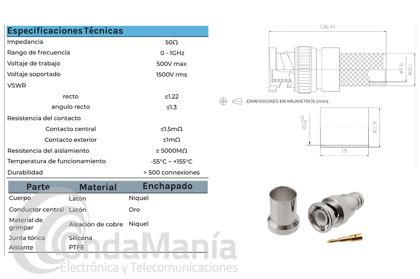 Conector BNC macho aéreo para crimpar en cable RG-213, PTFE o similares