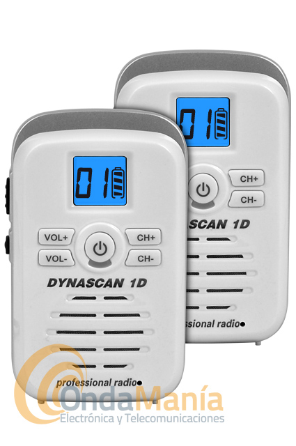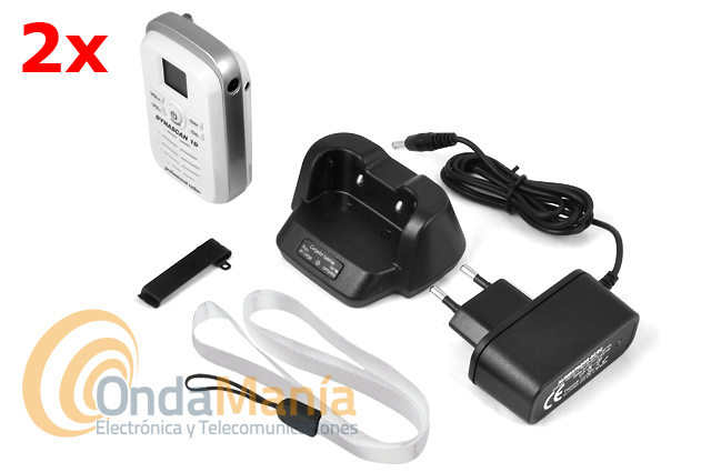 El pack incluye: 2 Dynascan 1D blanco, 2 baterías de litio con 1800 mAh, 2 cargadores de sobremesa con alimentador, 2 clips de cinturón, 2 correas de mano, 2 pinganillos y 2 manuales de instrucciones en castellano.