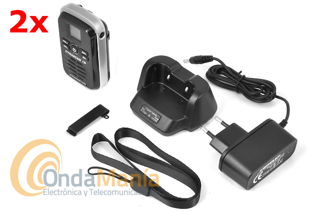 El pack incluye: 2 Dynascan 1D negros, 2 baterías de litio con 1800 mAh, 2 cargadores de sobremesa con alimentadores, 2 clips de cinturón, 2 correas de mano, 2 pinganillos y manual de instrucciones en castellano.