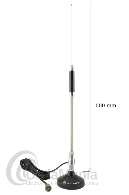 Midland 18-244 antena magnética para la banda de 27 Mhz. (CB). La antena tiene una longitud de 60 cm., la base magnética un diámetro de 9 cm. y el cable 2,50 mts., incluye conector PL en el extremo del cable.