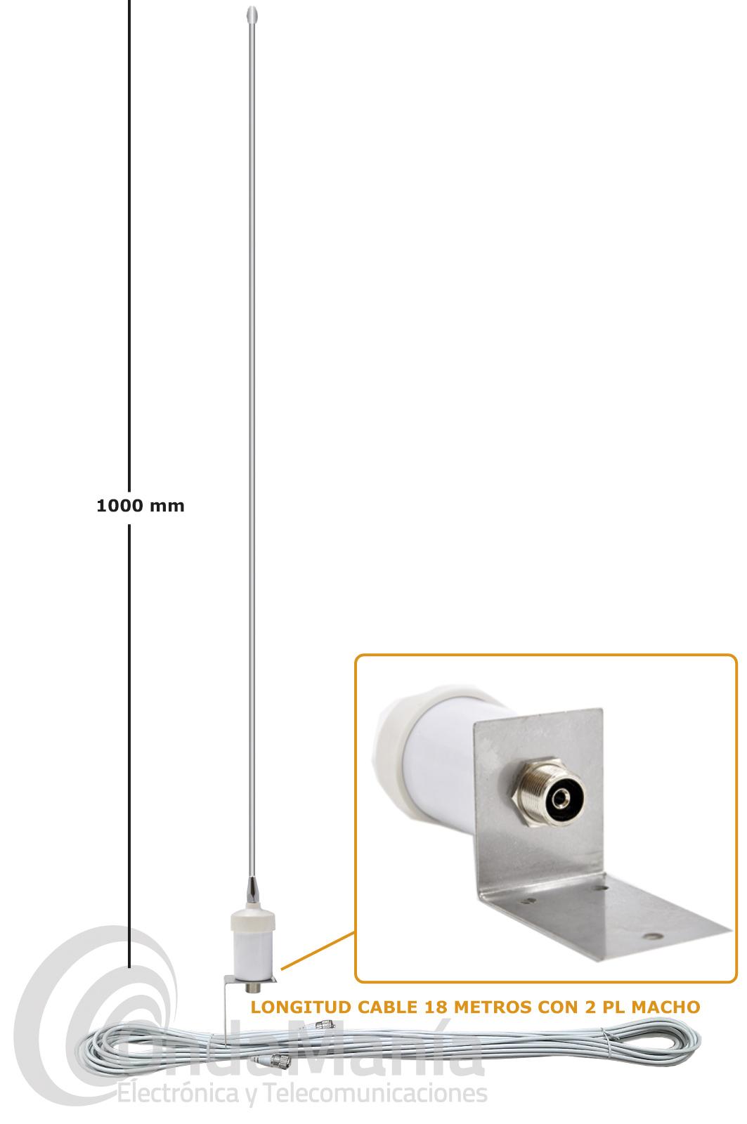 Antena de acero inoxidable náutica de VHF Albrecht AE Marine Masttop 3200 VHF con 1 metro de longitud, ideal para instalarla en la parte superior de cualquier mástil del barco, incluye soporte tipo escuadra y 18 metros de cable de color blanco con 2 conectores PL