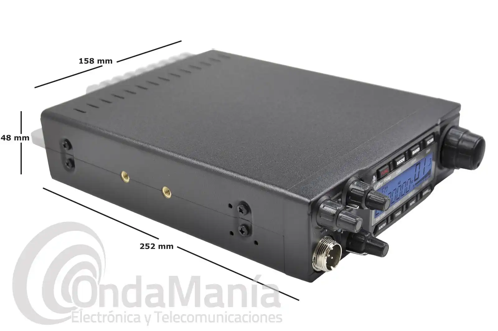 Transceptor móvil todo modo AM, FM, USB, LSB con una potencia máxima de 80 W PEP en SSB, 80 W PEP en AM y 50 W en FM, dispone de squelch automático ASQ con 9 niveles, VOX con 9 niveles de sensibilidad, pasos de frecuencia: 0 Hz, 100 Hz, 1 Khz, 5 kHz, 10 KHz, 100 KHz, 1 Mhz, 1 Mhz, DTMF, función NCR cancelación de ruido en TX y RX, pantalla LCD con 7 opciones de color y atenuación de luz de fondo.