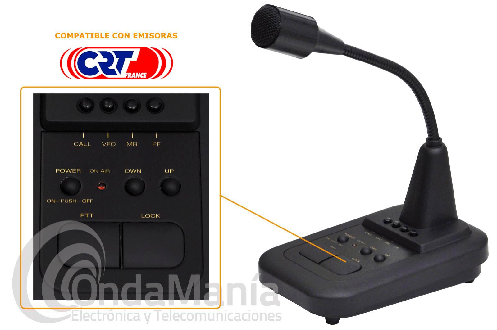 Micrófono de sobremesa compatible con la emisora CRT SS-7900, el micrófono tiene la posibilidad de conexión para dos equipos simultáneos con el selector A/B, tono de voz constante, independientemente de la voz, susurrando, fuerte, etc.... Los botones UP/DOWN no son compatibles.