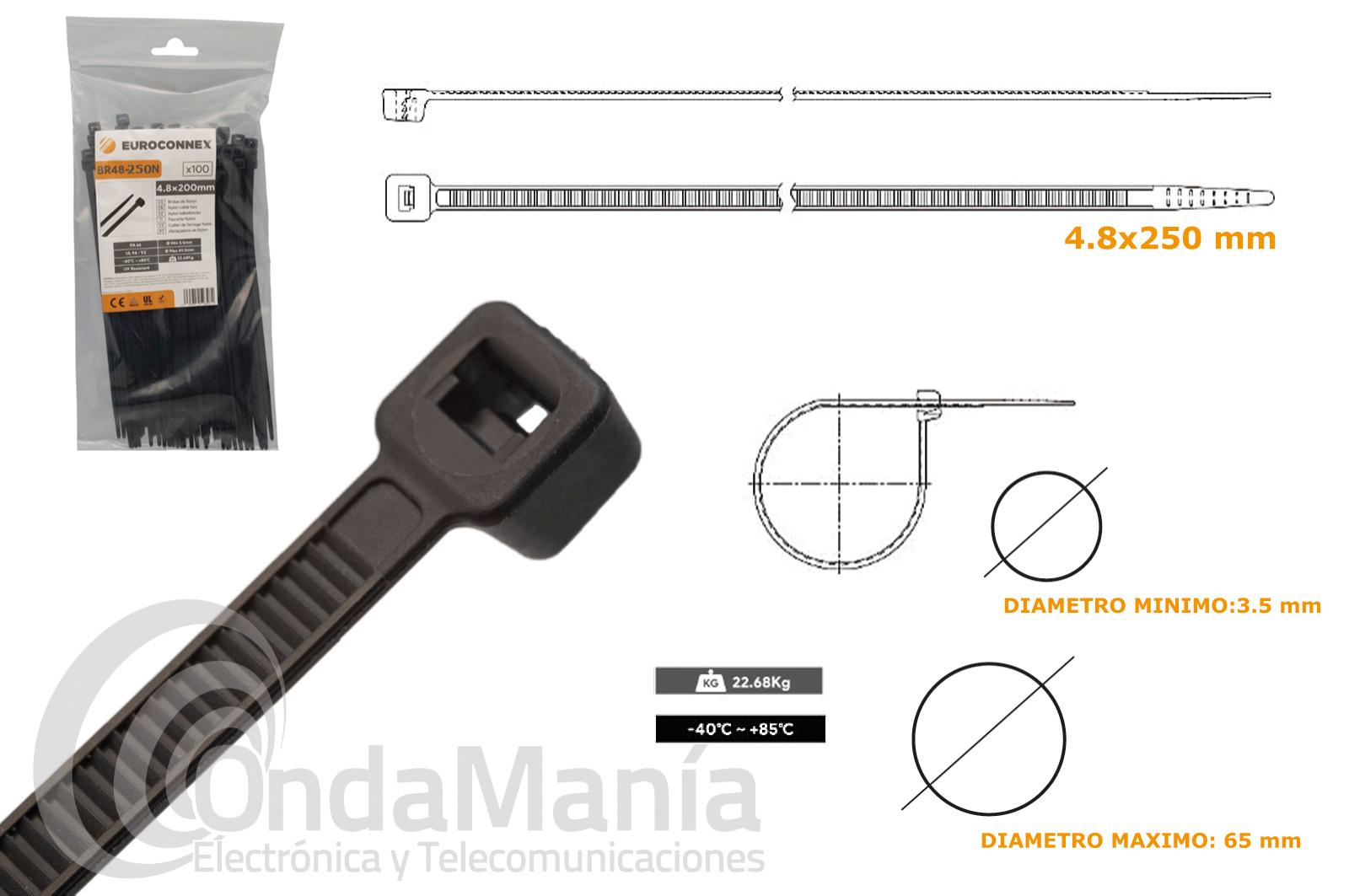 Bolsa de 100 bridas de sujeción de poliamida 66 (nylon) con un ancho de 4,8mm y 250 mm de longitud, color negro,...