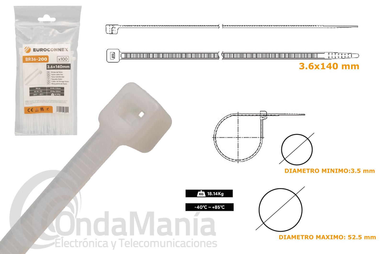 Bolsa de 100 bridas de sujeción de poliamida 66 (nylon) con un ancho de 3,6 mm y 200 mm de longitud, color natural,...