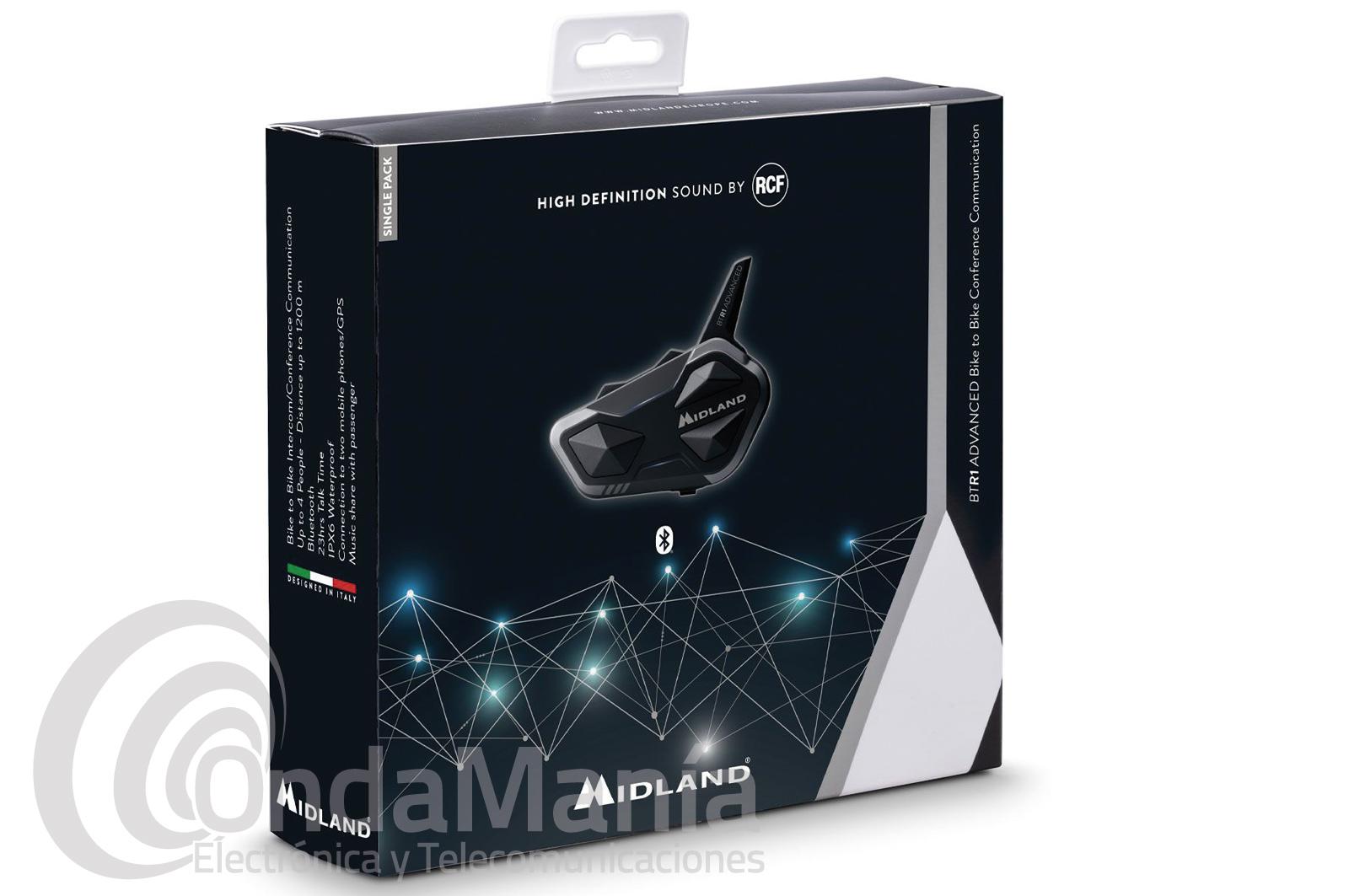 El intercomunicador para moto Midland BTR1 ADVANCED es un equipo con la mejor relación precio/rendimiento. Adelantado a los demás de su categoría, el Midland BTR1 Avanced está equipado con una tecnología que en modo Conferencia permite que 4 personas se comuniquen entre sí en modo conferencia hasta una distancia de 1.200m entre moto y moto. El BTR1 ADVANCED también es pionero en calidad de sonido, que llega a los oídos del motociclista a través de un sistema de audio dedicado, diseñado por el departamento de I+D de la marca RCF.