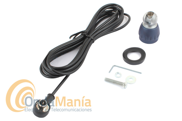 Base de antena y cable con conectores para las series Turbo de Sirio como la Turbo 800, Turbo 1000, Turbo 2000, Turbo 3000, Turbo 5000,.... incluye conector PL y el cable RG-58 una longitud de 4,5 mts aprox.