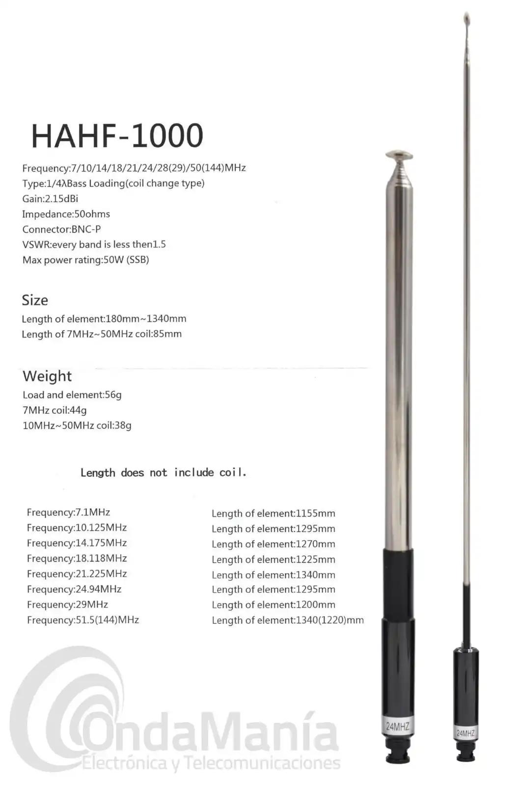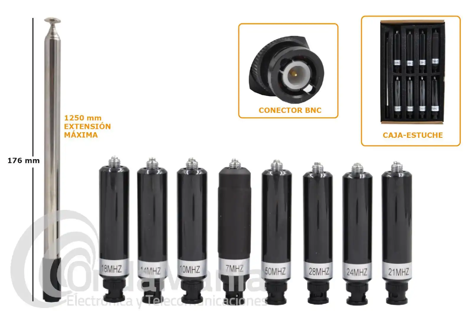 Kit compuesto por una varilla telescópica y 8 bobinas intercambiables sobre dicha varilla telescópica, compatible en las bandas de HF: 7.1, 10.125, 14.175, 18.118, 21.225, 24.94, 29, 51.5 y 144 Mhz.