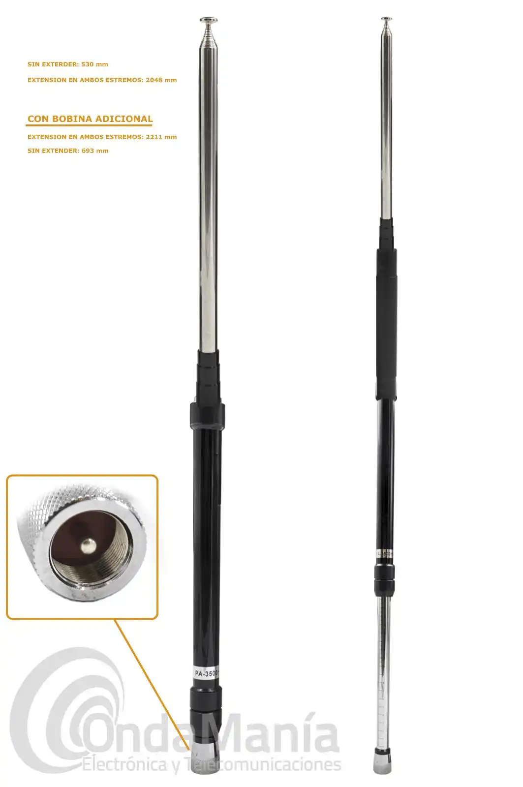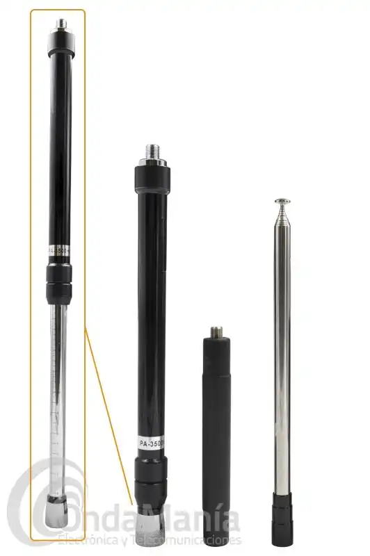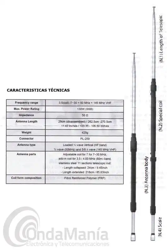 Antena portátil ideal para uso en vehículos, con un rango de frecuencia de 3.5, 7, 30, 50 y 145 Mhz mediante un movimiento vertical de la bobina de carga en la base. Se puede instalar tanto sobre una base magnética (la base triple es ideal), o directamente sobre un soporte o base de antena en el vehículo.