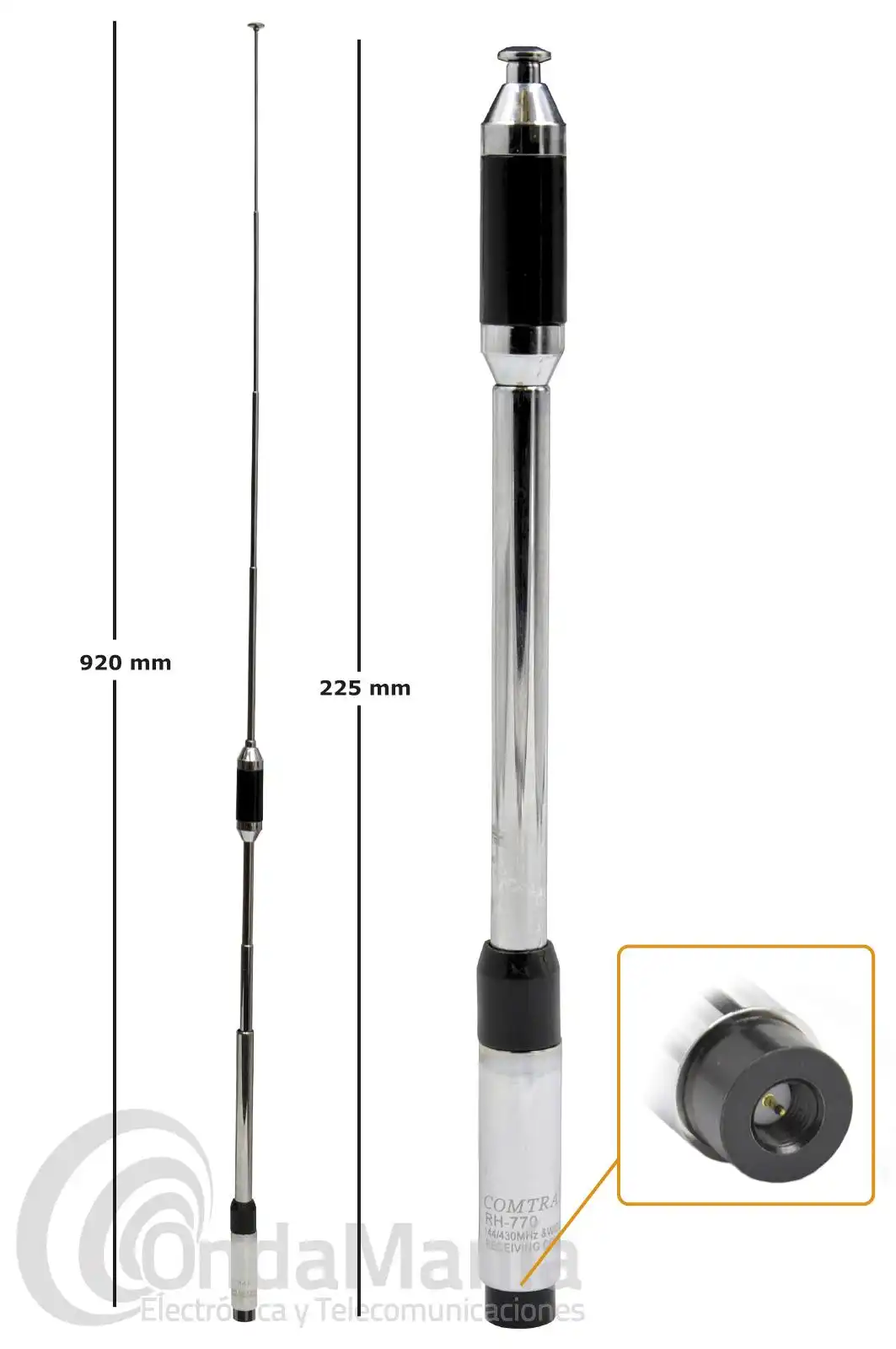 Antena telescópica doble banda SRH-770 SMA (144/430 MHZ) con conector SMA macho, con una longitud de 225 mm encogida y 920 mm extendida y una ganancia de 2.15 dBi en VHF y 5.5 dBi en UHF. Admite una potencia máxima de 15 W.