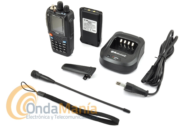 Presentación: Walky, antena flexible, cargador de sobremesa con cable USB, pack de batería de Li-Ion 2.600 mAh y clip cinturón, y guía rápida.