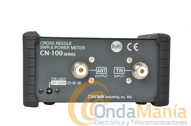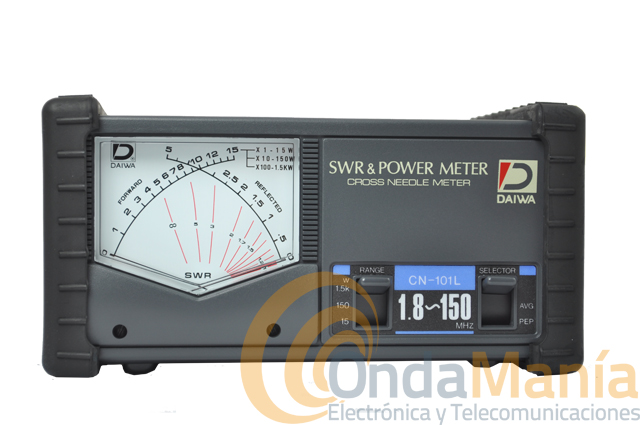 Medidor Daiwa CN-101L de agujas cruzadas con un rango de frecuencias desde 1.8 Mhz. hasta 150 Mhz., con una potencia máxima de 1.5 KW. Los conectores traseros son “PL”.
