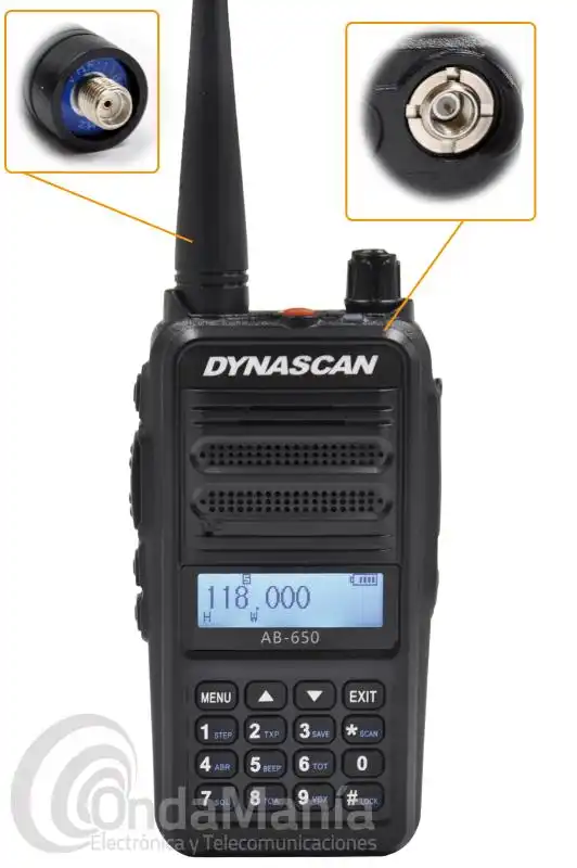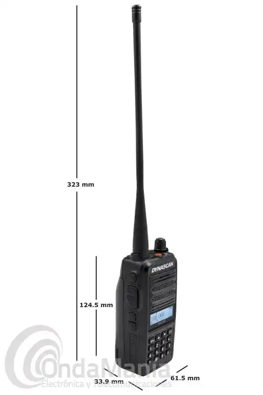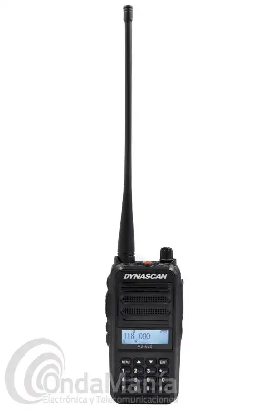 Walkie talkie de VHFde banda aérea de 118 a 136.975 Mhz, con una potencia ajustable de 1 a 5 W (6 W PEP), dispone de 400 canales de memoria, batería de 7,4 V con 2600 mAh, nombre de canal, bloqueo automático de teclado, cargador de sobremesa,...