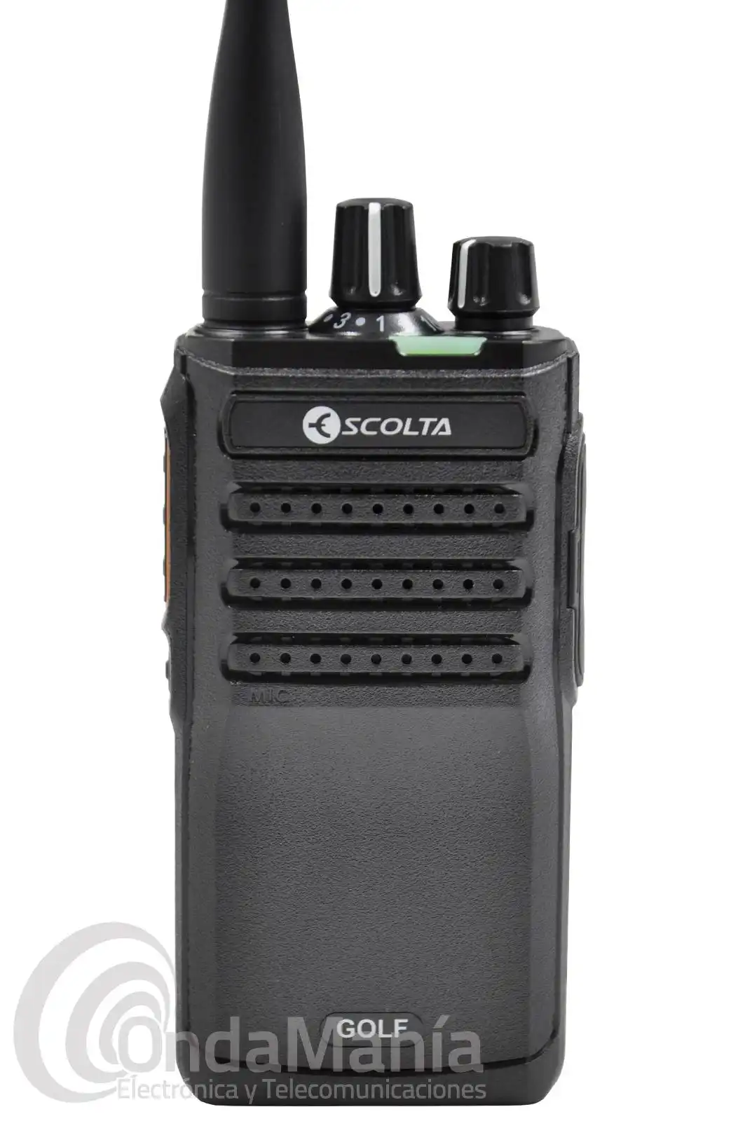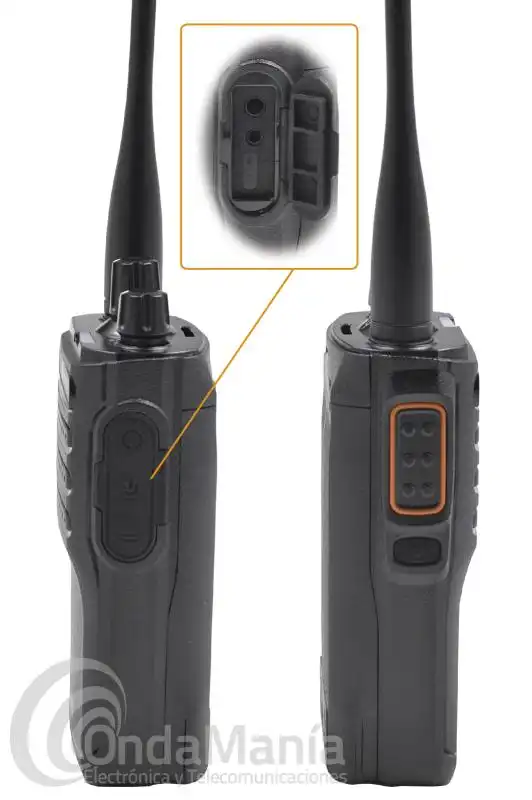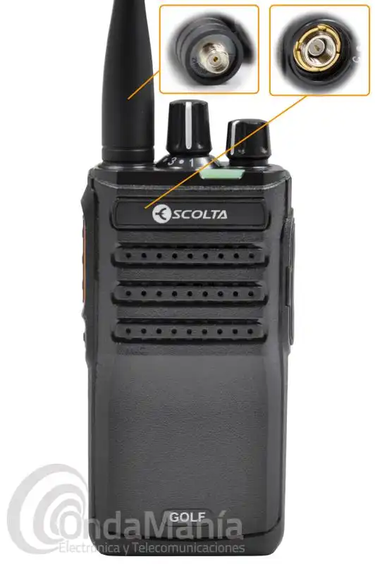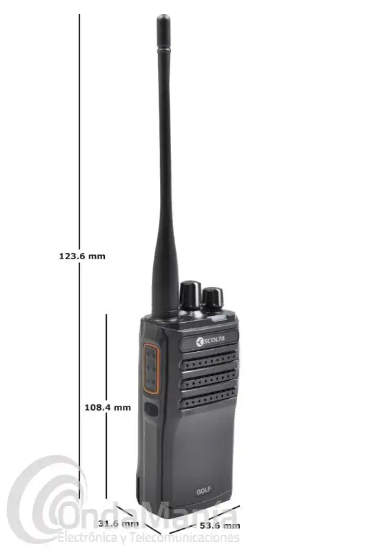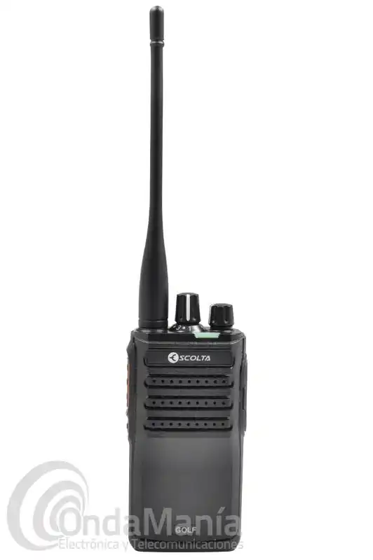 Walkie talkie de UHF analógico y DMR ESCOLTA GOLF RP-304, robusto, preciso y potente. Con un rango de frecuencia de 440 a 470 Mhz, con 32 canales divididos en 2 grupos, dispone de batería de litio con 7,4 V y 1600 mAh y cargador rápido de sobre-mesa.