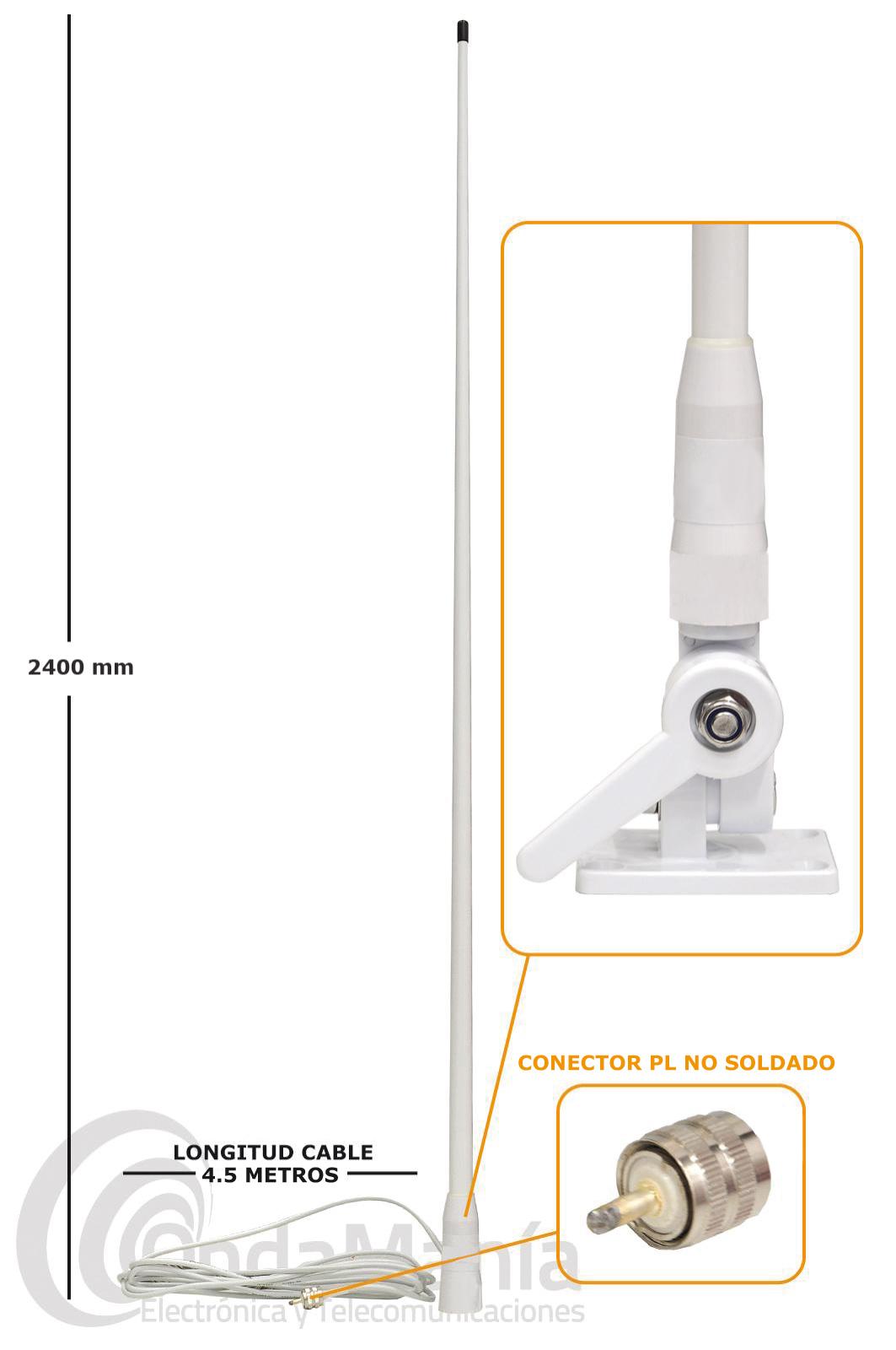 Antenas náutica de VHF con soporte articulado para instalación en cubierta, con 2,4 metros de longitud, 4,5 metros aprox. de cable blanco RG-58 y conector PL macho