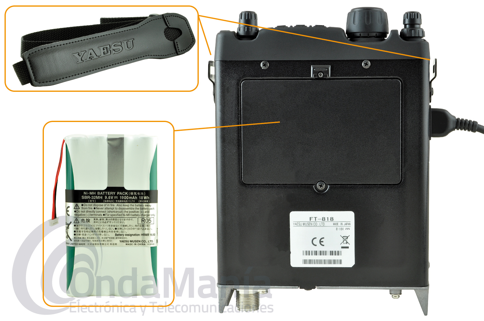El Yaesu FT-818 proporciona 6 W de potencia de salida sólida con una fuente de alimentación de CC externa. Incluye un pack de batería Yaesu SBR-32MH con una capacidad superior: 9,6 V y 1900 mAh.