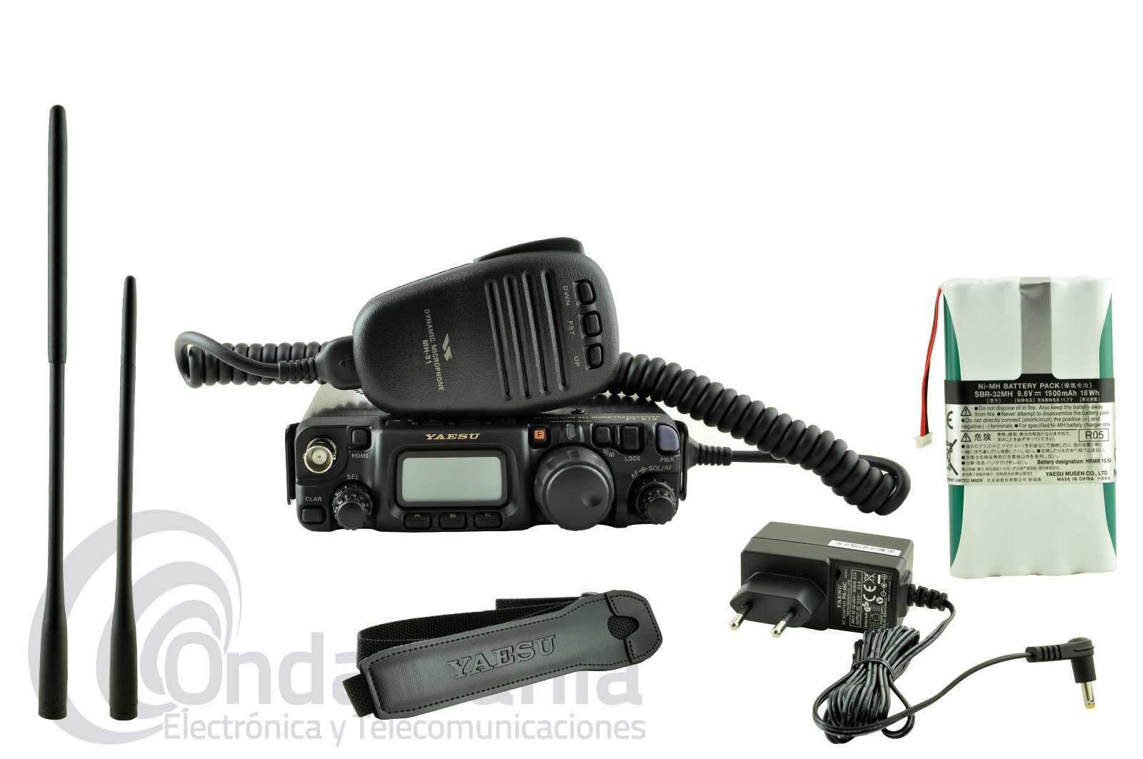 Accesorios suministrados: Micrófono de mano (MH-31A8J), Batería (SBR-32 9.6V 1900mAh Ni-MH ), Porta-pilas (FBA-28) (para 8 pilas AA), Antena YHA-63 de 50/144/430 Mhz, Cable de alimentación DC (E-DC-6), Cargador de batería PA-48, Correa (Bandolera) para el transporte, Soportes para la emisora, Soporte para el micrófono, Manual de instrucciones.