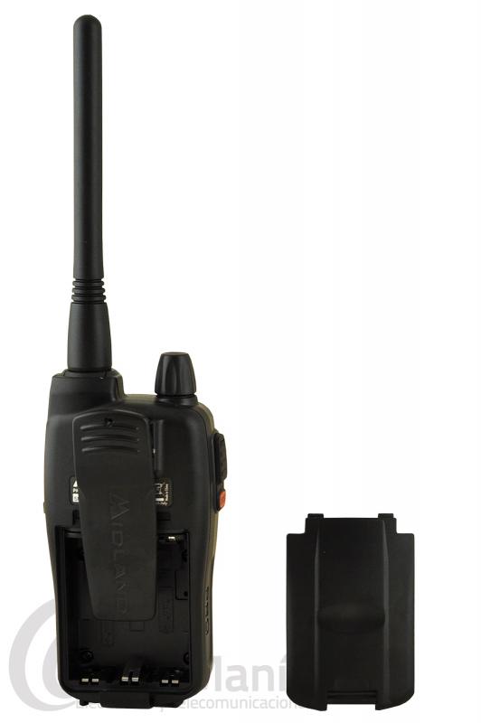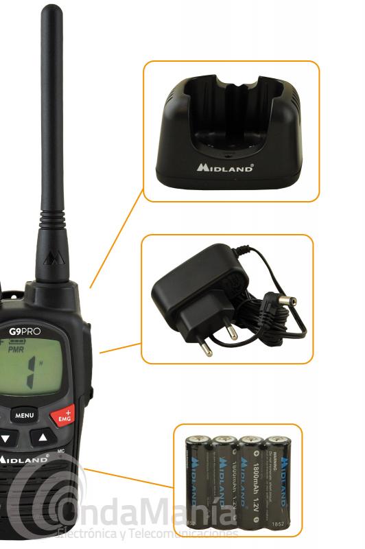 El pack incluye: 1 Midland G-9 PRO, cargador de sobremesa, adaptador de pared, 4 baterías AA recargables de Ni-MH con 1800 mAh y clip de cinturón.