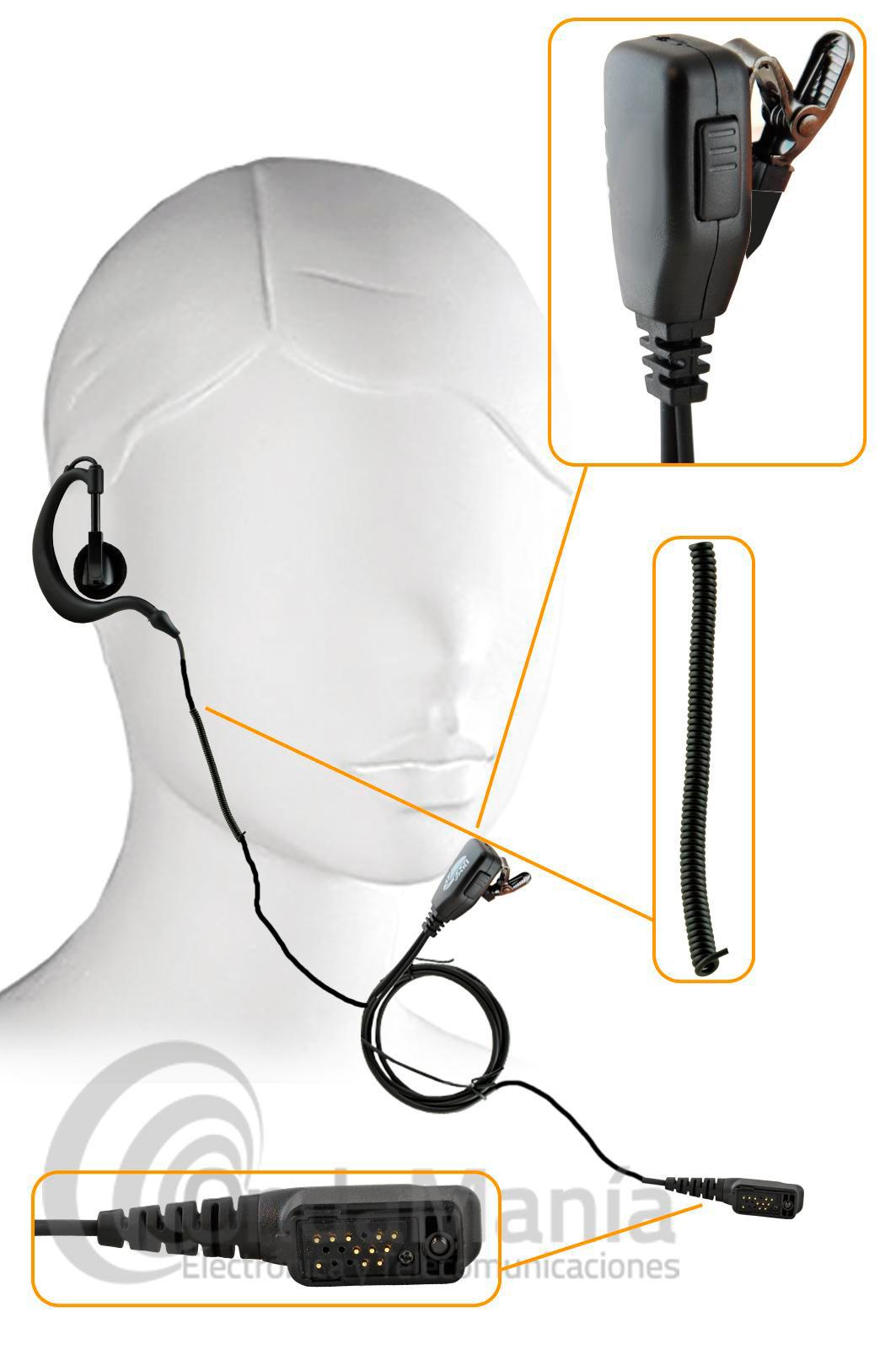Pinganillo compatible con el Airbus Tetrapol TPH-900, dispone de un auricular ergonómico con sujeción a la oreja y cable rizado, el micrófono dispone de un clip metálico y giratorio en la parte posterior. El cable es de color negro y en zonas rizado.