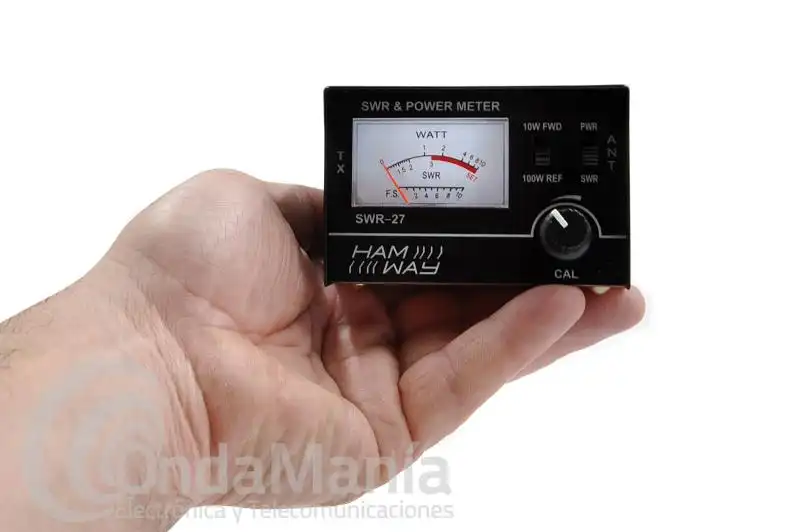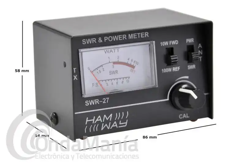 Medidor de ROE de 25 a 30 Mhz, con vatímetro. Rango fondo escala, 10 / 100 Watt. Se suministra con un latiguillo PL259 - PL259 con 50 cm de longitud