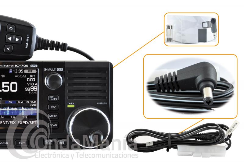Accesorios suministrados: IC-705, micrófono HM-243, batería BP-272, cable de alimentación, conector de llave CW, fusible de repuesto, soporte de micrófono y manual de instrucciones en castellano.