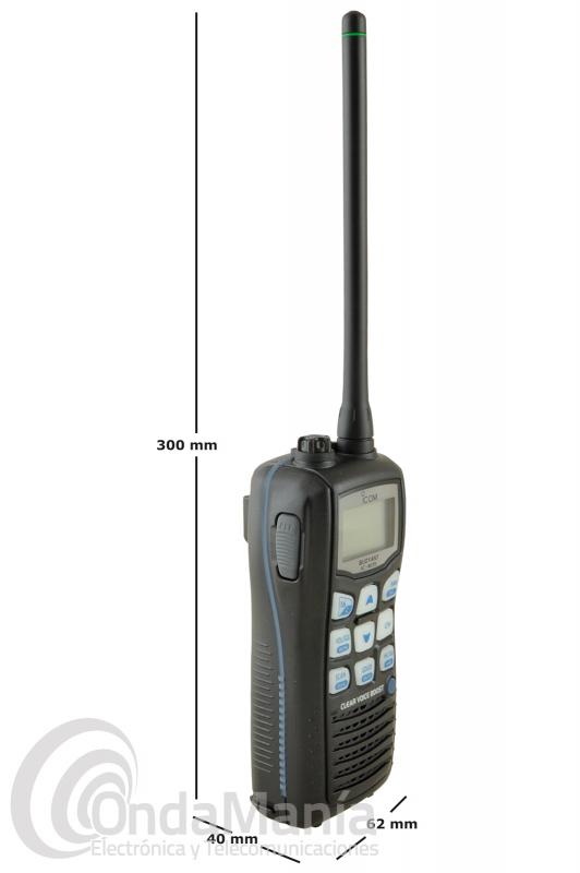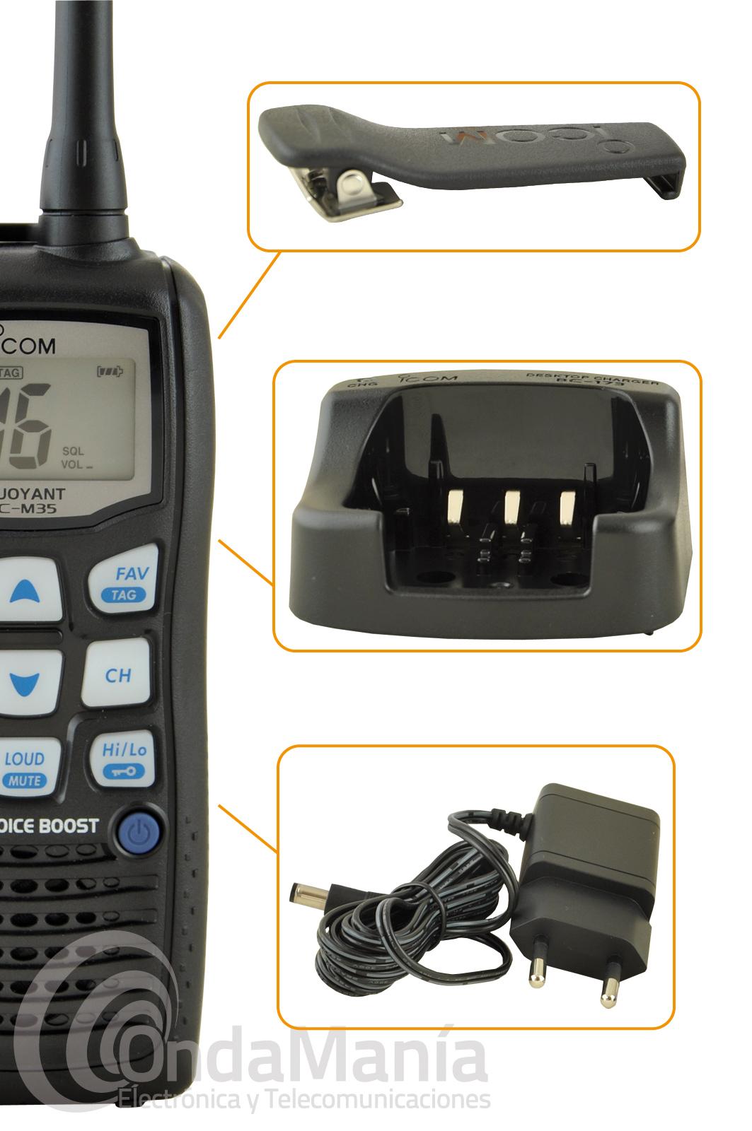 Icom IC-M35 walki talky de banda marina con batería de Ion-litio, construcción resistente al agua "watterproof" , 6 W. de potencia y novedosas funciones como: "Automatic Volume Adjustment" Eleva la claridad de la voz: El transceptor tiene la función de detección de ruido que permite ajustar el volumen de forma automática y función "Volume Loud" que permiten maximizar el nivel de volumen para ofrecer comunicaciones claras en ambientes marinos ruidosos. "Noise Cancellins Mic" Micrófono para cancelación de ruido: El sub-micrófono en el panel posterior invierte la fase y cancela el ruido de ambiente del micrófono principal. Como resultado, el transceptor reduce la influencia del ruido de fondo ( paryicularmente los ruidos medios) de la señal. Norma IPX7 Flota en el agua (1 m. durante 30 minutos): el equipo flota en el agua dulce o salada aunque tenga accesorios suministrados conectados. Puede que se hunda si se utilizan baterías, correas,... de otras marcas. Otras características opcionales: 6 vatios de potencia de transmisión 700 mW de salida de audio con el altavoz interno 8 Horas de autonomía (TX (Hi): Rx: reposo= 5:5:90) Nº de aprobación de la D.G.M.M. 52.0101 Accesorios suministrados de serie: